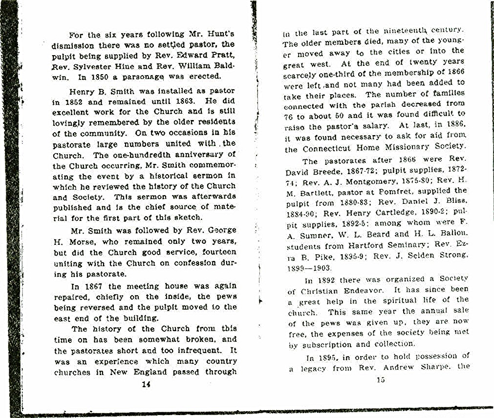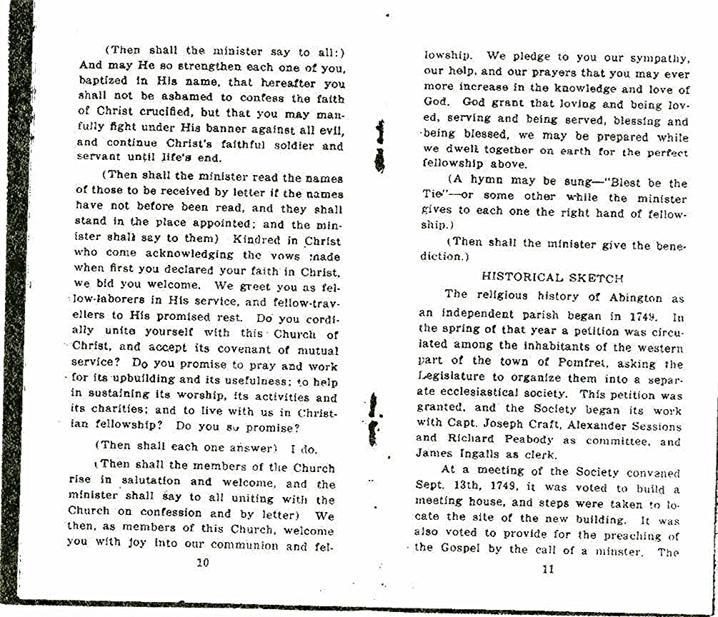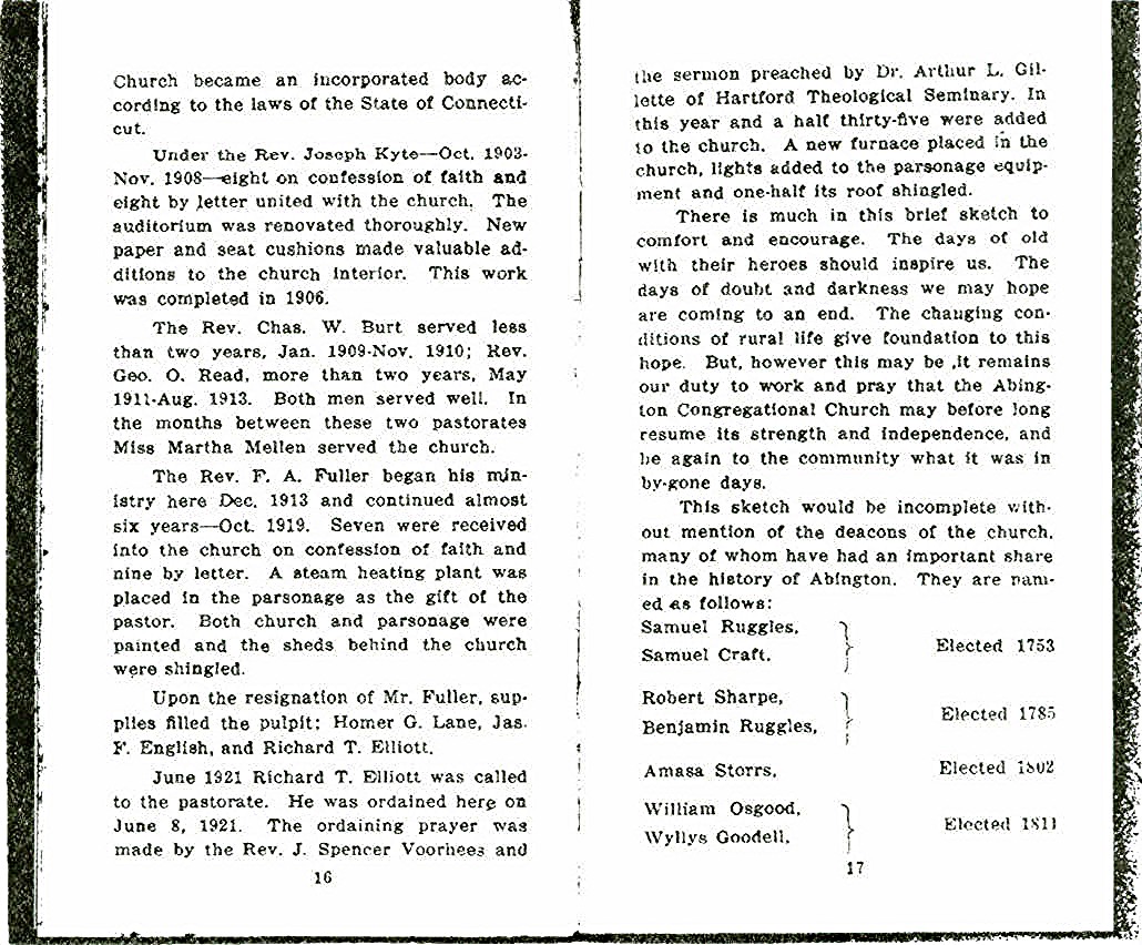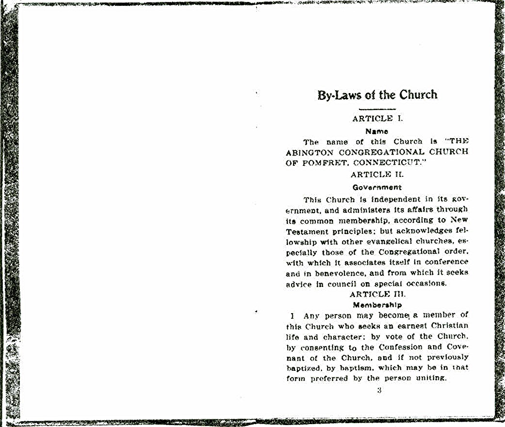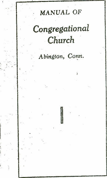 In 1930 the Congregational Church in Abington, Connecticut published a "Manual," which included the then-current by-laws and a brief historical sketch of the congregation up to 1922. This is reproduced below.
