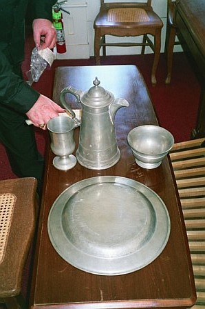 Here are the flagon, plate, cups, and baptismal bowl used for the Sacraments in the Abington Church in the 18th century. They are hallmarked in pewter.