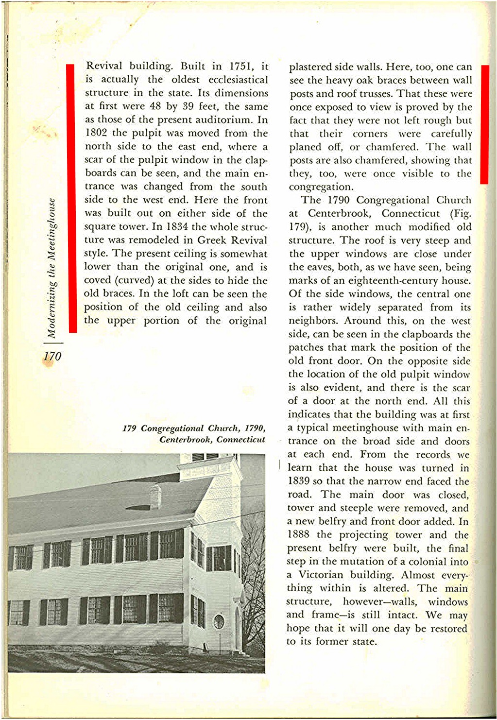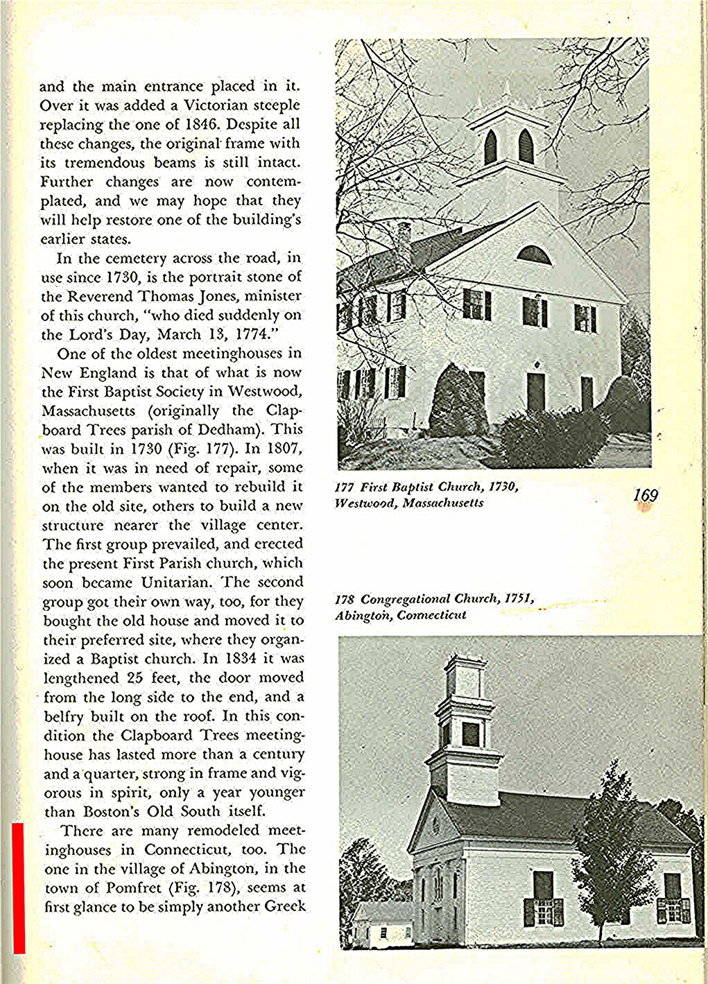 In 1969 Edmund Sinnott wrote "Meeting House and Churches in Early New England," published by McGraw Hill. The following is a JPEG image of his paragraphs on the Abington Church. Back to Homepage