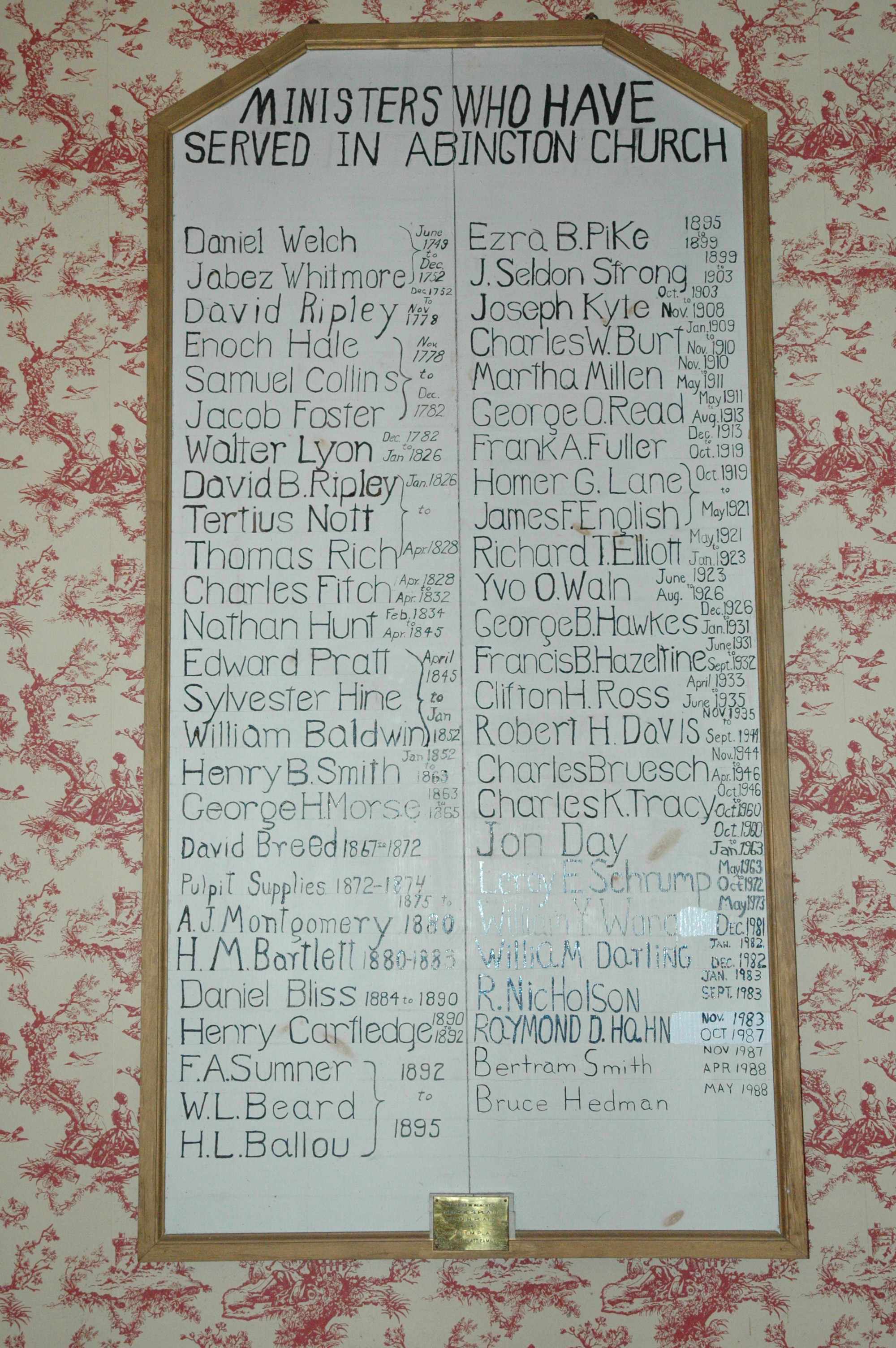 In the narthex of our meetinghouse hangs this mural which lists all the ministers who have served the Abington Congregational Church since 1749. .